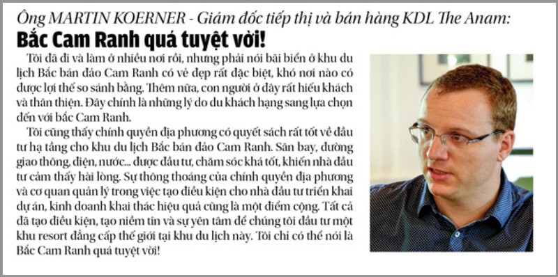 Ông MARTIN KOERNER - Giám đốc tiếp thị và bán hàng KDL The Anam, nhận xét: BẮC CAM RANH QUÁ TUYỆT VỜI!