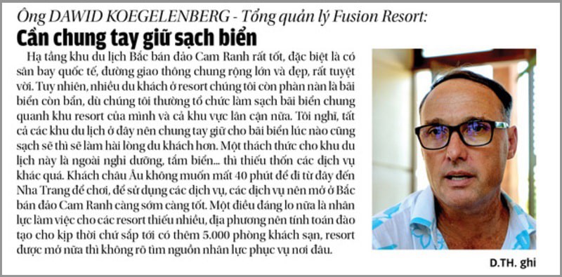 “Hạ tầng khu du lịch Bắc bán đảo Cam Ranh rất tốt, đặc biệt là có sân bay quốc tế, đường giao thông chung rộng lớn và đẹp, rất tuyệt vời. Tuy nhiên, nhiều du khách ở resort chúng tôi còn phàn nàn là bãi biển còn bẩn, dù chúng tôi thường tổ chức làm sạch bãi biển chung quanh khu resort của mình và cả khu vực lân cận nữa. Tôi nghĩ, tất cả các khu du lịch ở đây nên chung tay giữ cho bãi biển lúc nào củng sạch sẽ thì sẽ làm hài lòng du khách hơn. Một thách thức cho khu du lịch này là ngoài nghỉ dưỡng, tắm biển… thì thiếu thốn các dịch vụ khác quá. Khách châu u không muốn mất 40 phút để đi từ đây đến Nha Trang để chơi, để sử dụng các dịch vụ, các dịch vụ nên mở ở bán đảo Cam Ranh càng sớm, càng tốt. Một điều đáng lo nửa là nhân lực làm việc cho các resort thiếu nhiều, địa phương nên tính toán đào tạo cho kịp thời chứ sắp tới có thêm 5.000 phòng khách sạn, resort được mở nửa thì không rõ tìm nguồn nhân lực phục vụ nơi đâu”