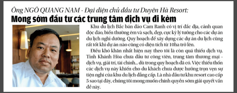 “Khu du lịch Bắc bán đảo Cam Ranh có vị trí đắc địa, cảnh quan độc đáo, biển thường êm và sạch, đẹp, cực kỳ lý tưởng cho các dự án du lịch nghỉ dưỡng. Quy hoạch để xây dựng các dự án du lịch cũng rất tốt khi dự án nào cũng có diện tích từ 10ha trở lên”