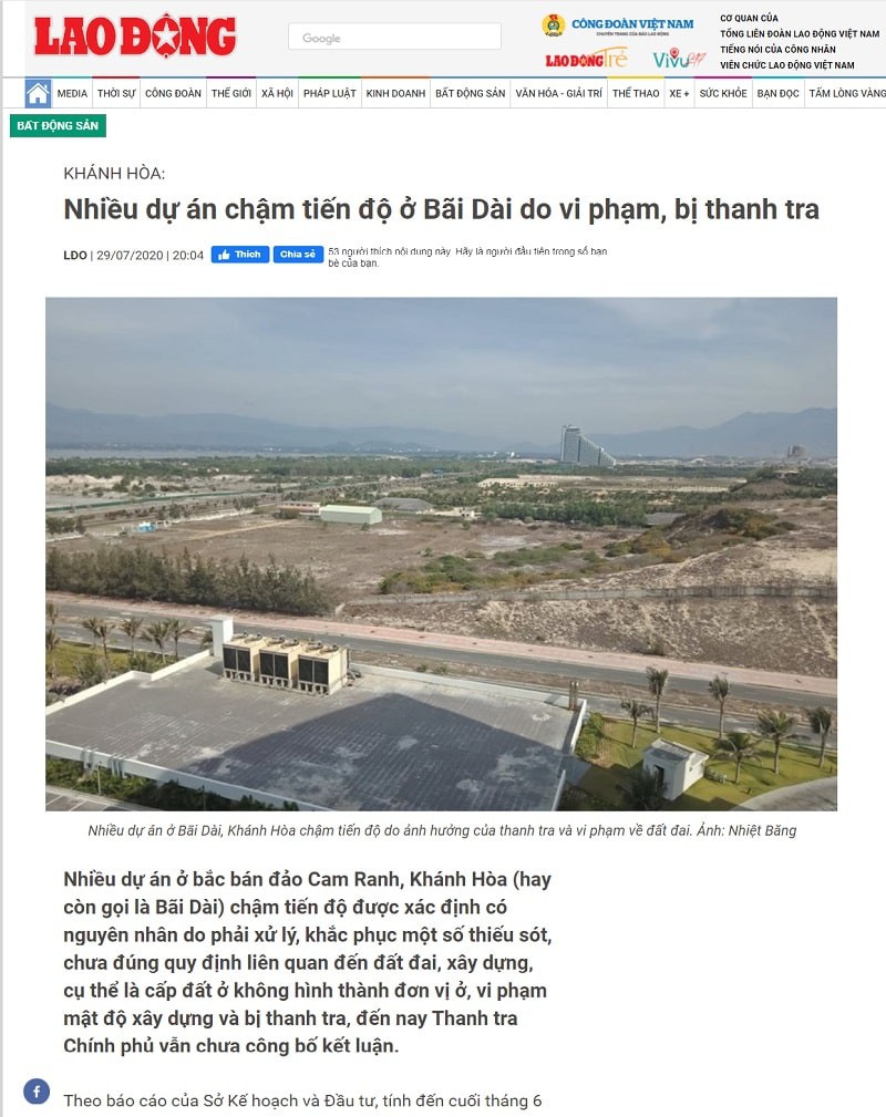 * Báo Khánh Hòa dẫn thông tin từ lãnh đạo Ban quản lý Khu du lịch (KDL) Bán đảo Cam Ranh, dự kiến đến cuối năm 2020 sẽ có thêm 5 dự án đi vào hoạt động:
